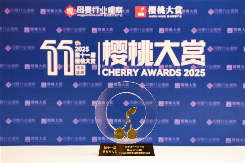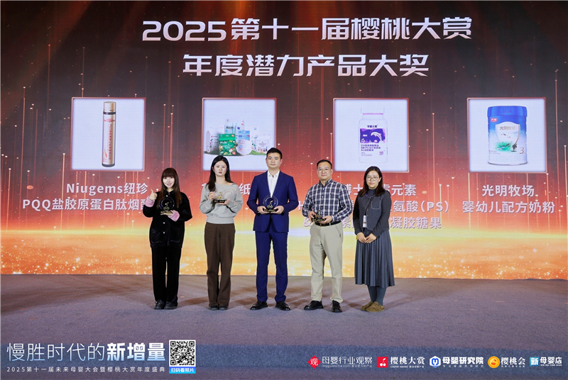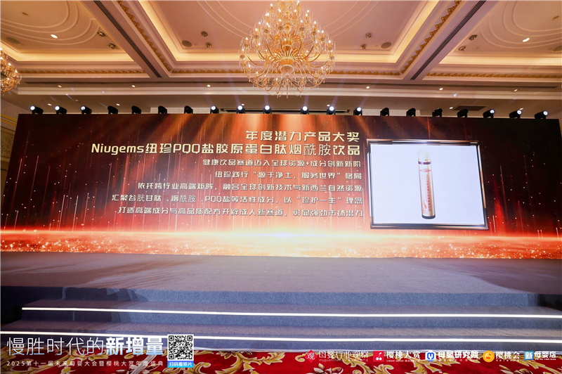 2025年12月2日,上海 —— 在母婴行业观察主办的“慢胜时代的新增量·2025第十一届未来母婴大会暨樱桃大赏年度盛典”上,Niugems纽珍旗下的PQQ盐胶原蛋白肽烟酰胺饮品凭借其产品理念与配方特点,荣获“年度潜力产品大奖”。这一荣誉是对产品创新的一种认可。